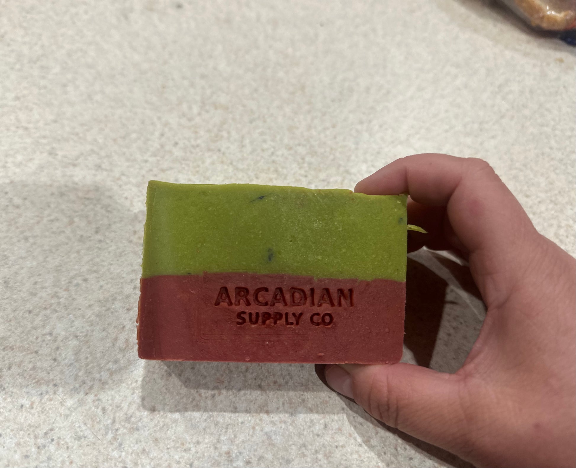 Cocos Nucifera (Coconut) Oil, Ricinus Communis (Castor) Seed Oil, Extra Virgin Olea Europaea (Olive) Fruit Oil, Elaeis Guineensis (Palm) Oil, Butyrospermum Parkii (Shea) Butter*, Sodium Hydroxide (Lye), Distilled Water, Farm Fresh Goat Milk, Mica (and) Iron Oxides for color, Arcadian’s Handcrafted Essential Oil Mix